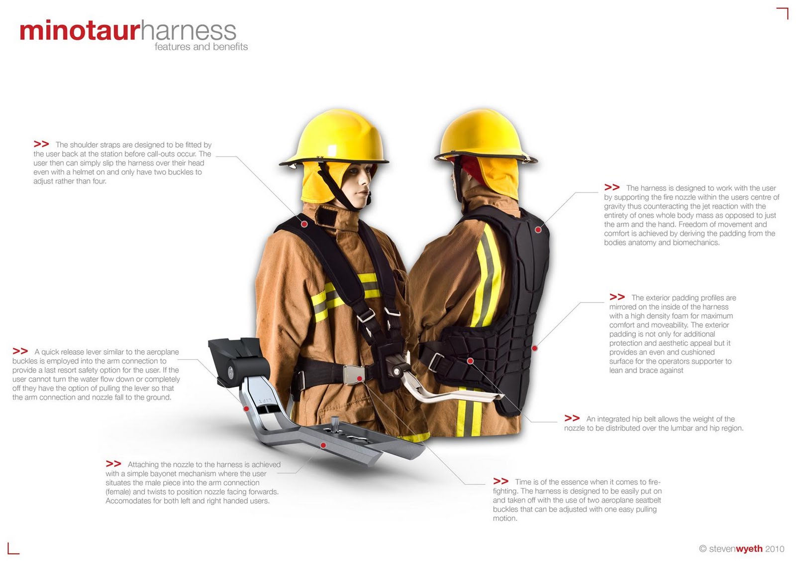 A investigação sobre os equipamentos utilizados pelos bombeiros rapidamente apresentou uma oportunidade para projetar um novo e inovador bico da mangueira de incêndio. A pesquisa foi realizada sobre o bico da mangueira atual a partir do qual descobri muitas falhas no design em termos de princípios fundamentais da ergonomia. Eu examinei a experiência do usuário, que apoiei com a minha própria experiência de funcionamento do bico da mangueira. Durante o processo de pesquisa que eu estava desenvolvendo minhas idéias e hipóteses que viria a materializar-se como um modelo para avaliar a minha concepção de soluções propostas. Meu projeto inicial faltou inovação, me propus a desenvolver um produto que seria um desafio e dar início a uma nova direção no combate a incêndios, design de equipamento. O princípio chave do meu projeto era para aliviar a força da pressão da água da mão do usuário e no braço. Mais pesquisas produzidas novas ideias e esboços que foram exploradas usando isopor e tecido de chita. Meu projeto foi então finalizado com CAD e protótipos físicos, a ponto de ser manufaturado.