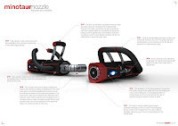 Minotauro é um sistema de distribuição de água que proporciona maior controle, funcionalidade e conforto para o usuário quando extinção de incêndios, independentemente da duração da operação. O projeto funciona com o usuário não contra eles. Para utilizar a massa de corpo inteiro para neutralizar a pressão da água do bocal de oposição está ligado ao arreio no centro de gravidade. Liberdade de movimento e conforto ao mesmo tempo usando o cinto é conseguido através de preenchimento de contorno do corpo que se move com o usuário. Avanços no controle do bico são obtidos com o fluxo livre alça oferecendo posições manuseio dinâmico. Manipular ângulos foram calculados de forma que o usuário está por cima do bico com o punho situado em uma posição neutra. O Minotauro bico da mangueira de fogo atingiu os objetivos que estabeleceu a partir de minha pesquisa. É um desenho mais ergonômico, que proporciona ao usuário maior conforto e controle durante a sua utilização quando comparado com orifícios existentes.